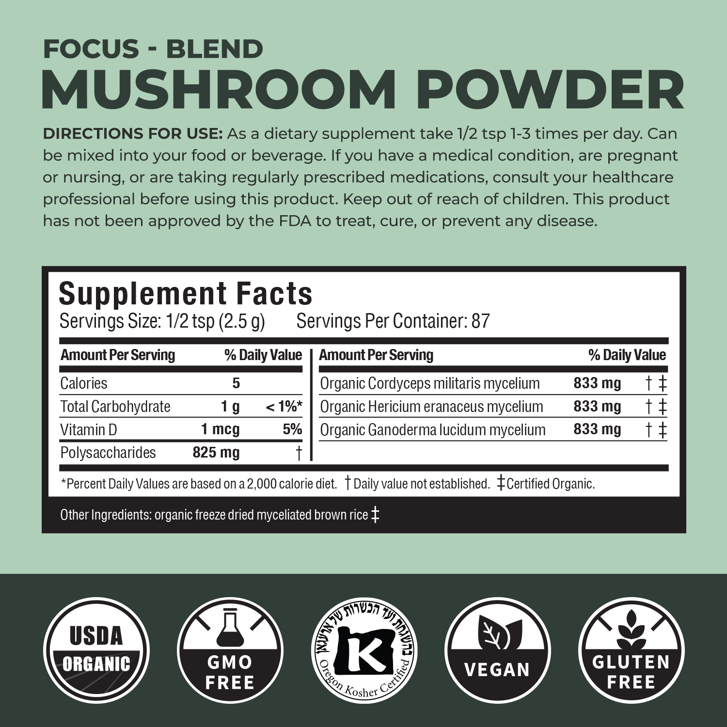 Keeping your mind sharp is key for those who require high focus for work, study, or play. Our Focus Mushroom Powder will give you that support. This carefully crafted blend of USDA Organic Cordyceps, Lion's Mane, and Reishi will help decrease mental fog, confusion, and stress to keep you focused.